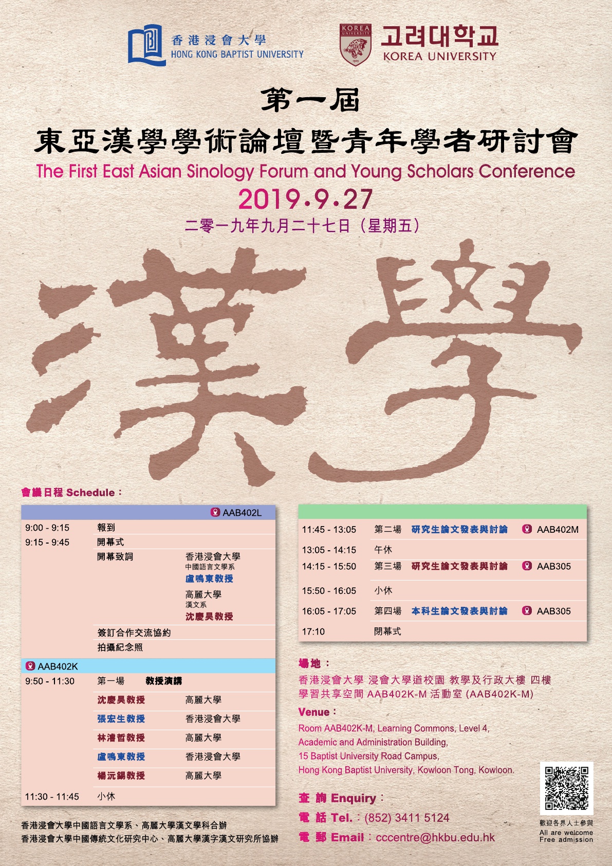 고려대학교 한자한문연구소(한문학과)와 香港浸會大學 中國傳統文化硏究中心(中文系)이 2019년부터 대학원생 중심의 학술 교류를 진행하게 되었습니다. 이 학술 교류 행사의 일환으로 ‘제1회 東亞漢學靑年學術論壇’을 개최합니다.