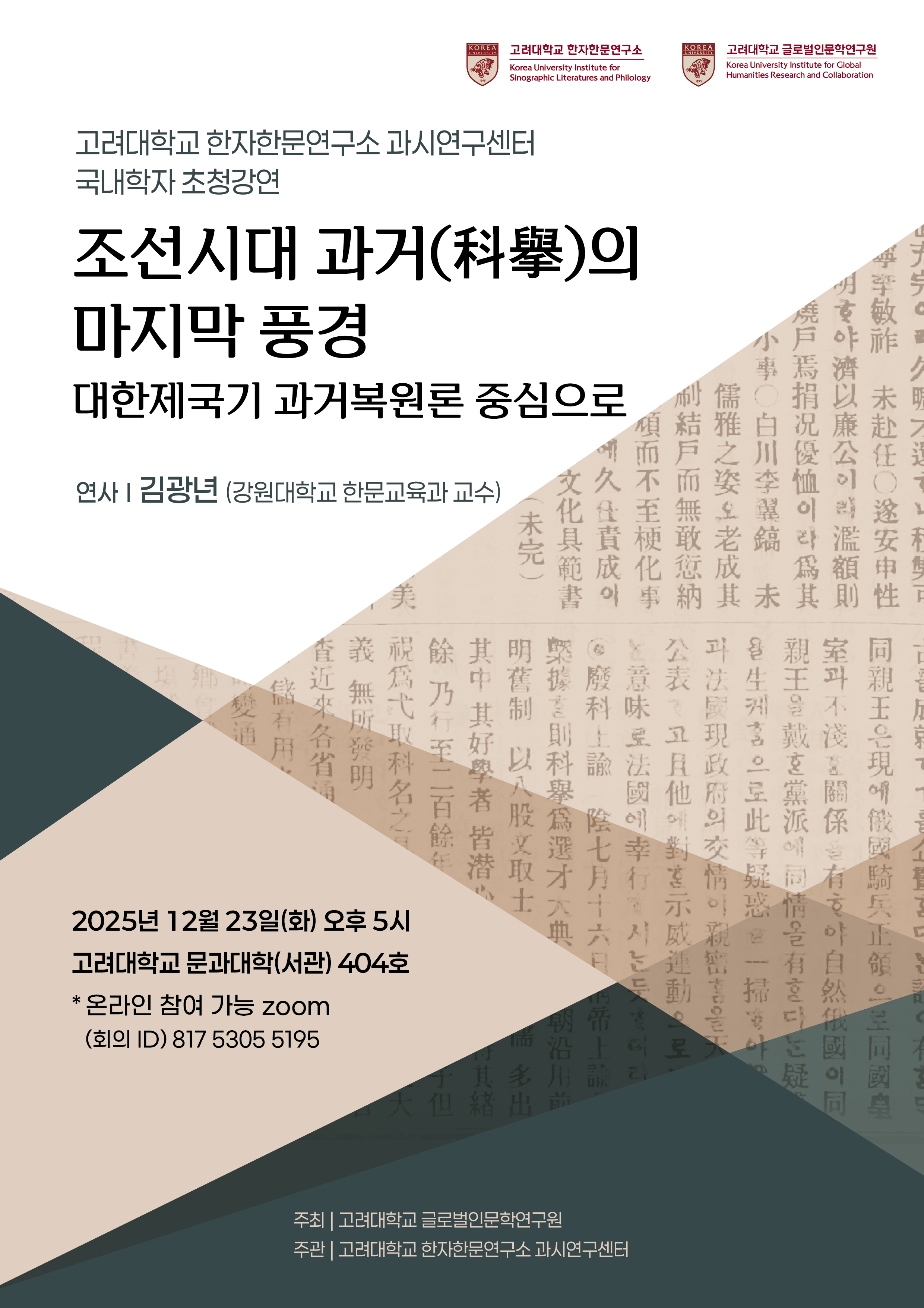 고려대학교 글로벌인문학연구원 주최, 고려대학교 한자한문연구소 과시연구센터 주관으로 김광년 교수님을 모시고 다음과 같은 초청 강연을 개최하고자 합니다. 온라인 및 오프라인 모두 열려있으니 많은 참여 바랍니다.