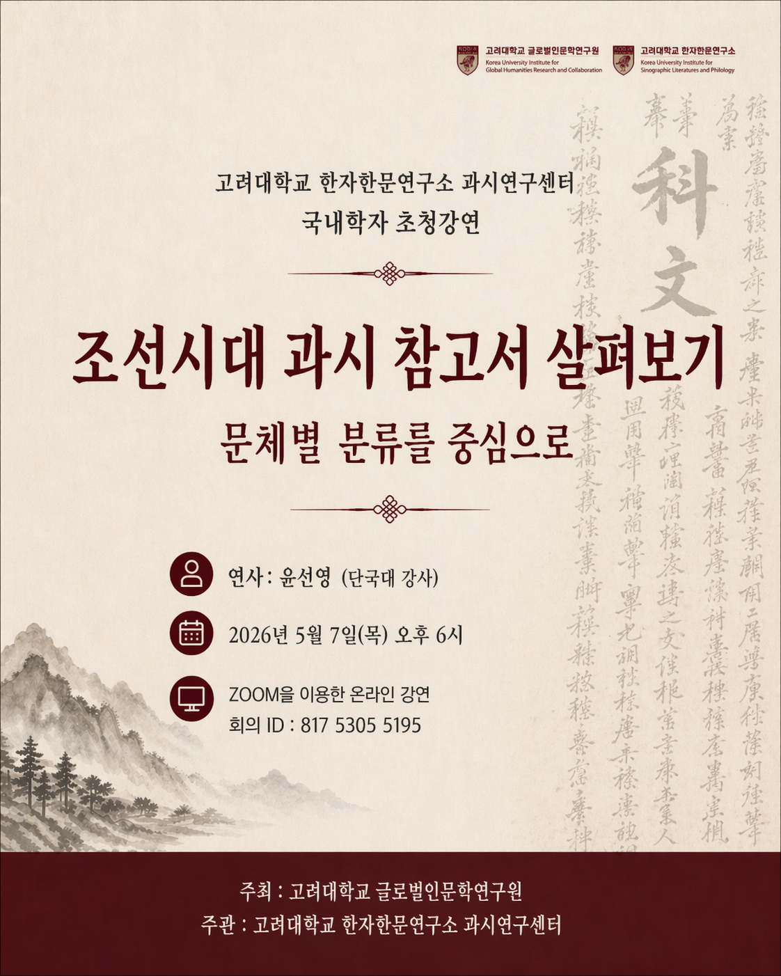 고려대학교 글로벌인문학연구원 주최, 고려대학교 한자한문연구소 과시연구센터 주관으로 과시전문가인 윤선영 선생님을 모시고 다음과 같은 초청 강연을 개최하고자 합니다. 많은 참여 바랍니다.